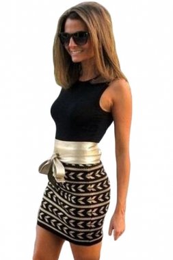 Vestido de minifalda para mujer, con lazo de cinturón, talla 38-40, color negro y dorado
