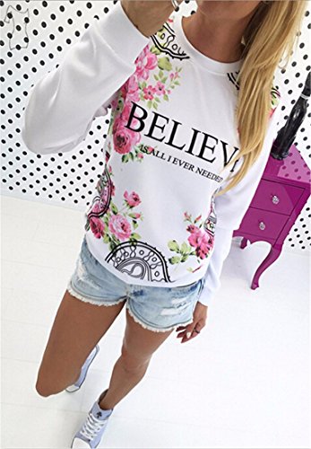 Tops De Manga Larga De La Camiseta Ocasional De Base Blanca Florales Impresa